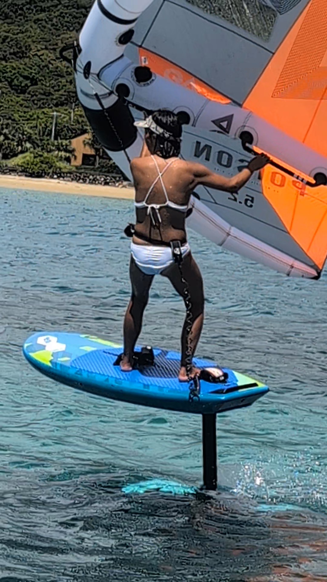 ウイング体験: 初回は大きいスクールボードで、ウイングをトリムしながら風に乗って走ります。初回から浮き上がって走るのはかなり難しいですが、ぜひ奄美ブルーの美しい海で、その日への第一歩を踏み出してください!